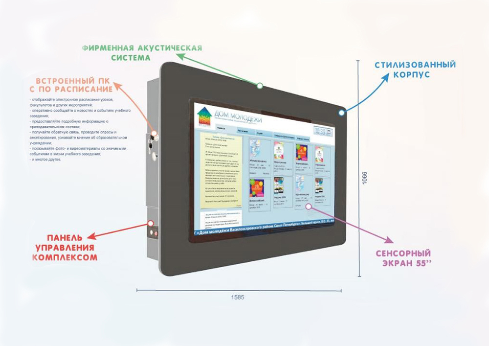 - на интерактивной панели, которая обычно располагается в холлах, вестибюлях, коридорах и рекреациях, полностью отображается необходимая учащимся информация.