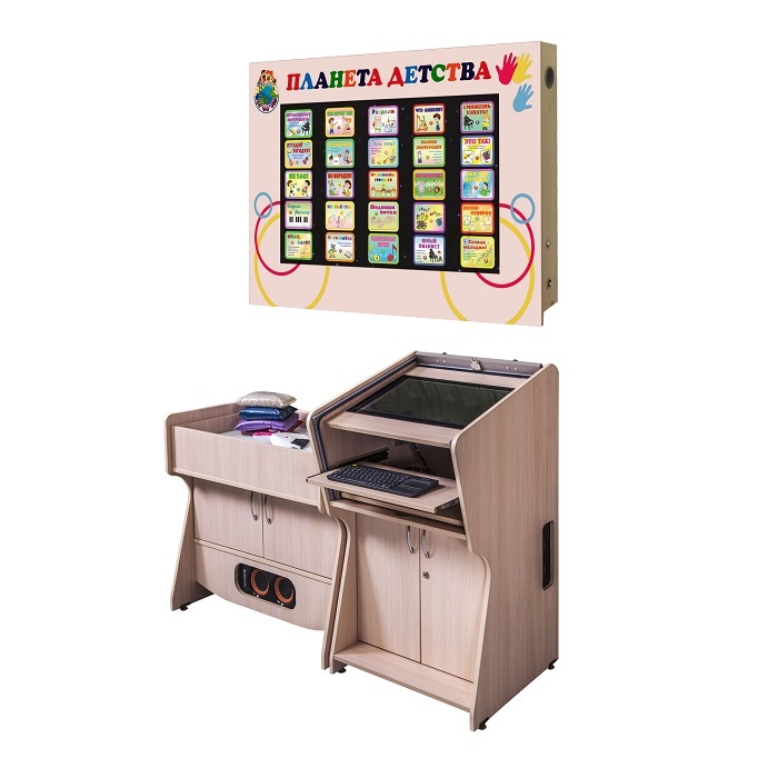 Интерактивный световой комплекс содержит 2 рабочие области: область для работы с песком и интерактивную поверхность со встроенным ПК и интерактивную сенсорную панель для видеоотображения.