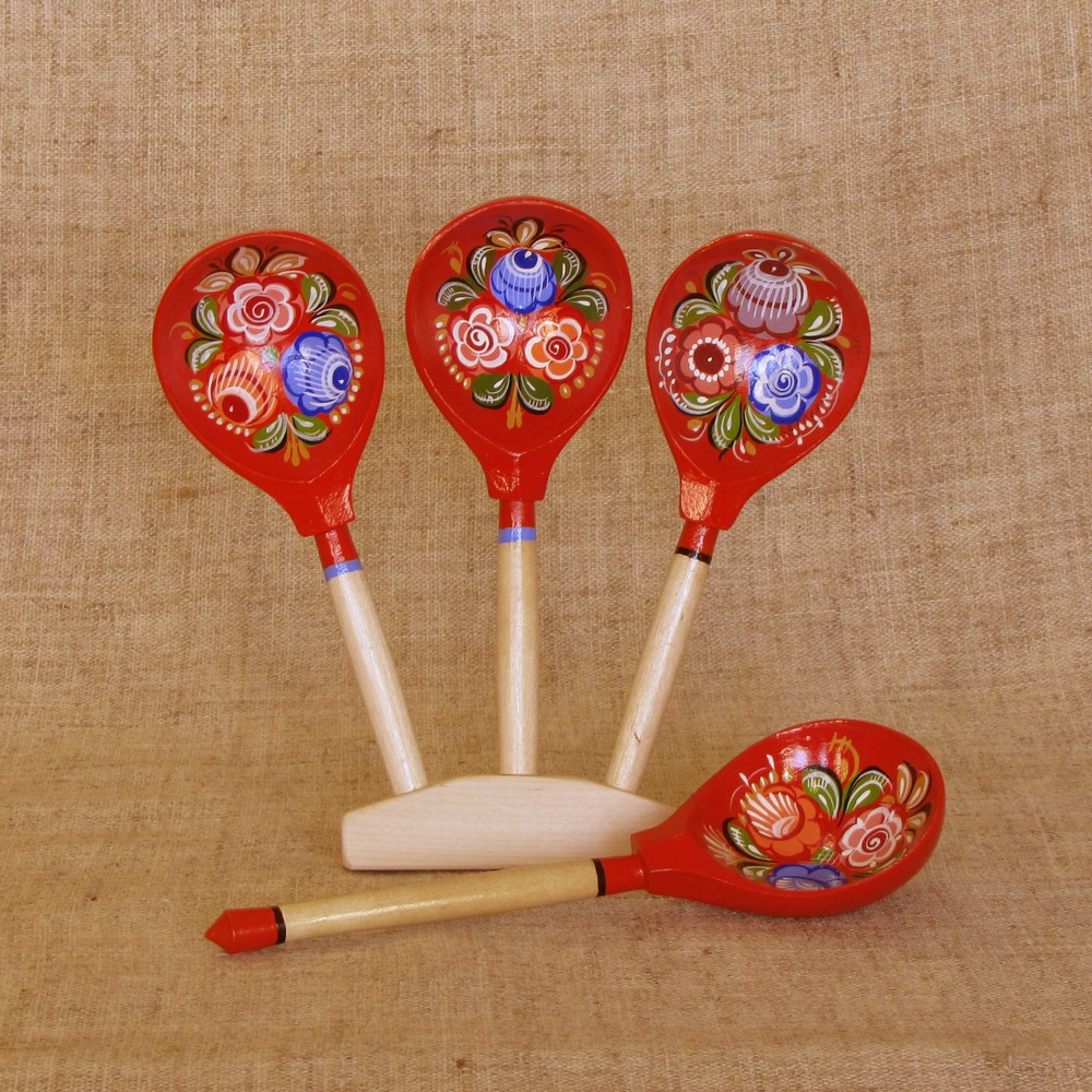 Ложки расписаны Хохломской и Городецкой росписью на предприятиях нижегородских художественных промыслов.