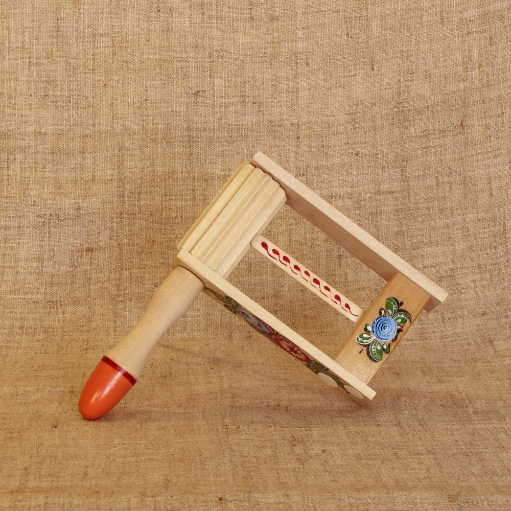 Представляет собой зубчатый барабан, совмещенный с ручкой. На зубчатом барабане вверху и внизу крепятся пластины, соединенные прямоугольной бобышкой. В бобышку вклеена деревянная пластина, которая упирается в барабан. При вращении барабана пластина перескакивает по зубцам и издает громкие щелчки. Вращение может осуществляться в любую сторону.