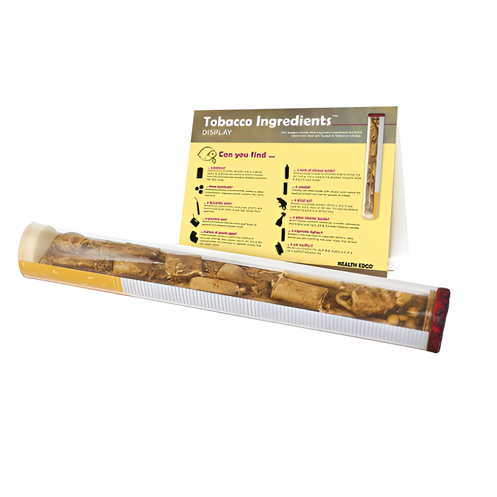 Токсические вещества, обнаруживаемые в табачном дыме, легче запомнить путем ассоциирования с привычными и внешне непривлекательными субстанциями. Данная обращающая на себя внимание трехмерная модель из плексигласа напоминает сигарету и при этом позволяет зрителям увидеть, что реально содержит табачный дым.