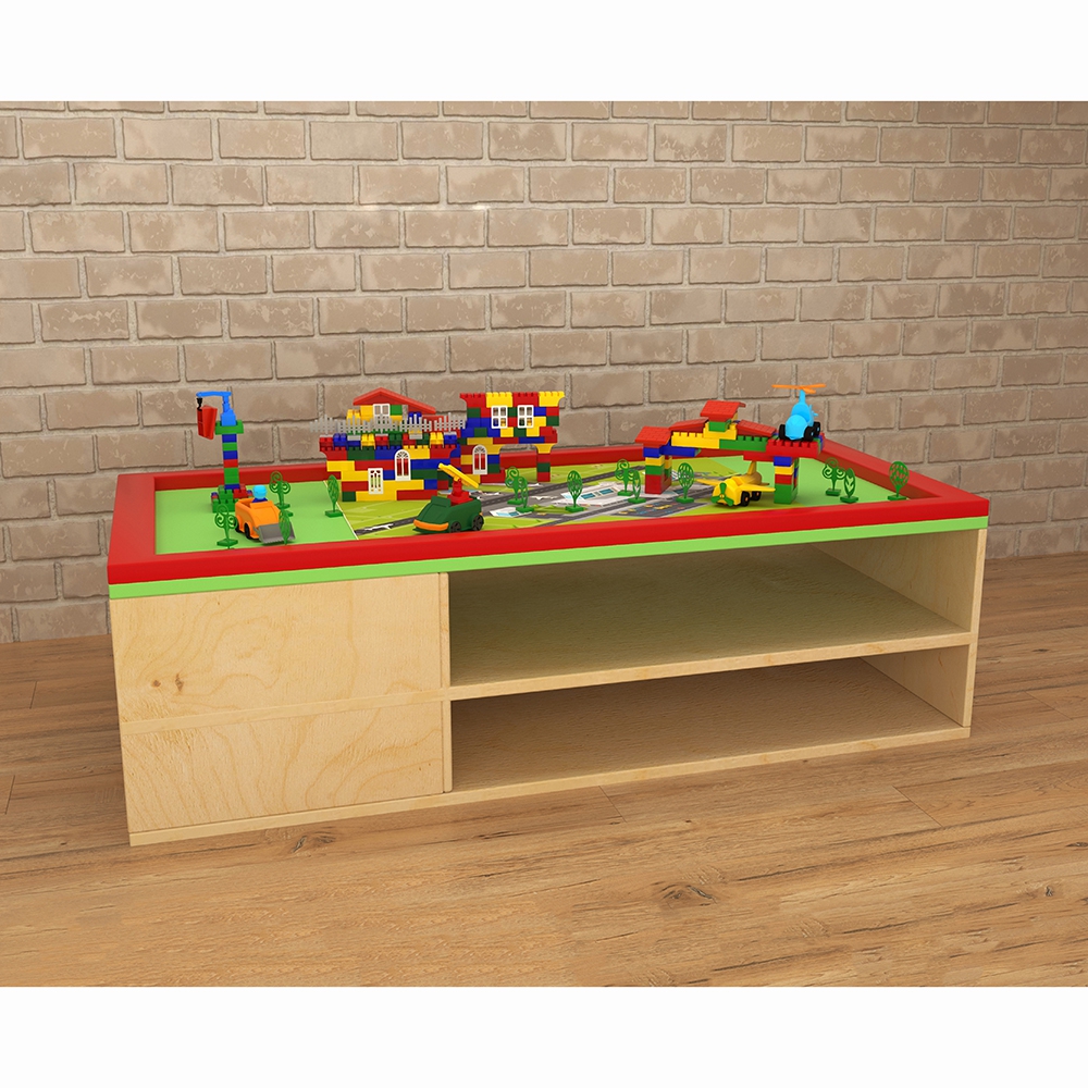 Расположенные на поверхности стола локации полянок с пчёлками и лесными деревьями познакомят ребят с устройством отдельных составляющих природы вокруг. На боковых сторонах стола имеются приспособления для развития мелкой моторики – счёты, меловая доска и т.д. В открытых полках стола расположены боксы, наполнение каждого – это отдельная развивающая игра, предназначенная для развития разнообразных навыков у детей.