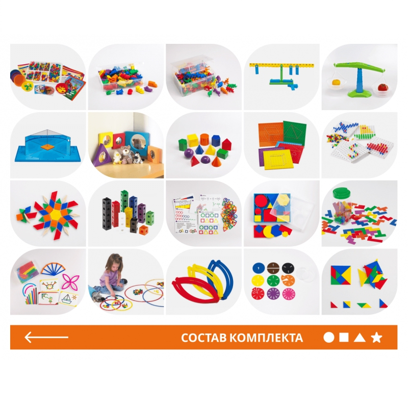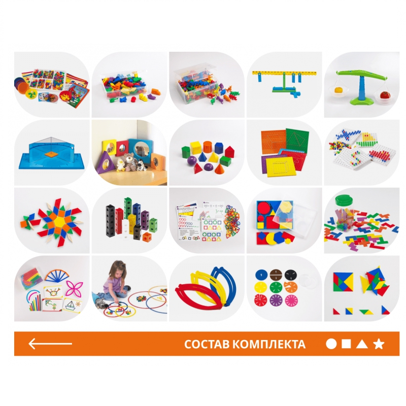 Комплект состоит из многофункциональных пособий, которые помимо математических навыков выполняют также и ряд других функций: