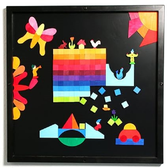Размеры этой магнитной доски позволяют собирать магнитные сюжетные картины больших размеров из нескольких наборов. Эту доску можно куда-нибудь повесить или поставить, сохранив при этом созданное изображение.