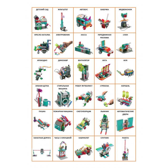 Модели: детский садик, бабочку, Эйфелеву башню. Роботы: робот-флагшток, робот-школьный автобус, робота-мишкв, робот-инвалидное кресло, робот-электровеник, робот-футболист, робот-электрическая зубная щетка, робот-стиральная машина, робот-морская яхта, робот-жук, робот-кассовый аппарат, робот-рекламная машина, робот-слоник, робот-крокодил, робот-динозавр, робот-электровентилятор, робот-стрекоза, робот-корабль, робот-пушка, робот-ветряная мельница, робот-раздвижной мост, робот-самолет, робот-поезд, робот-кабриолет, робот-пожарная машина, робот-снегоуборщик, робот-лыжник, робот-автоматические двери, робот-канатная дорога, робот-часы с кукушкой, робот-космический зонд, робот-спутник-трансформер, робот-космический корабль.