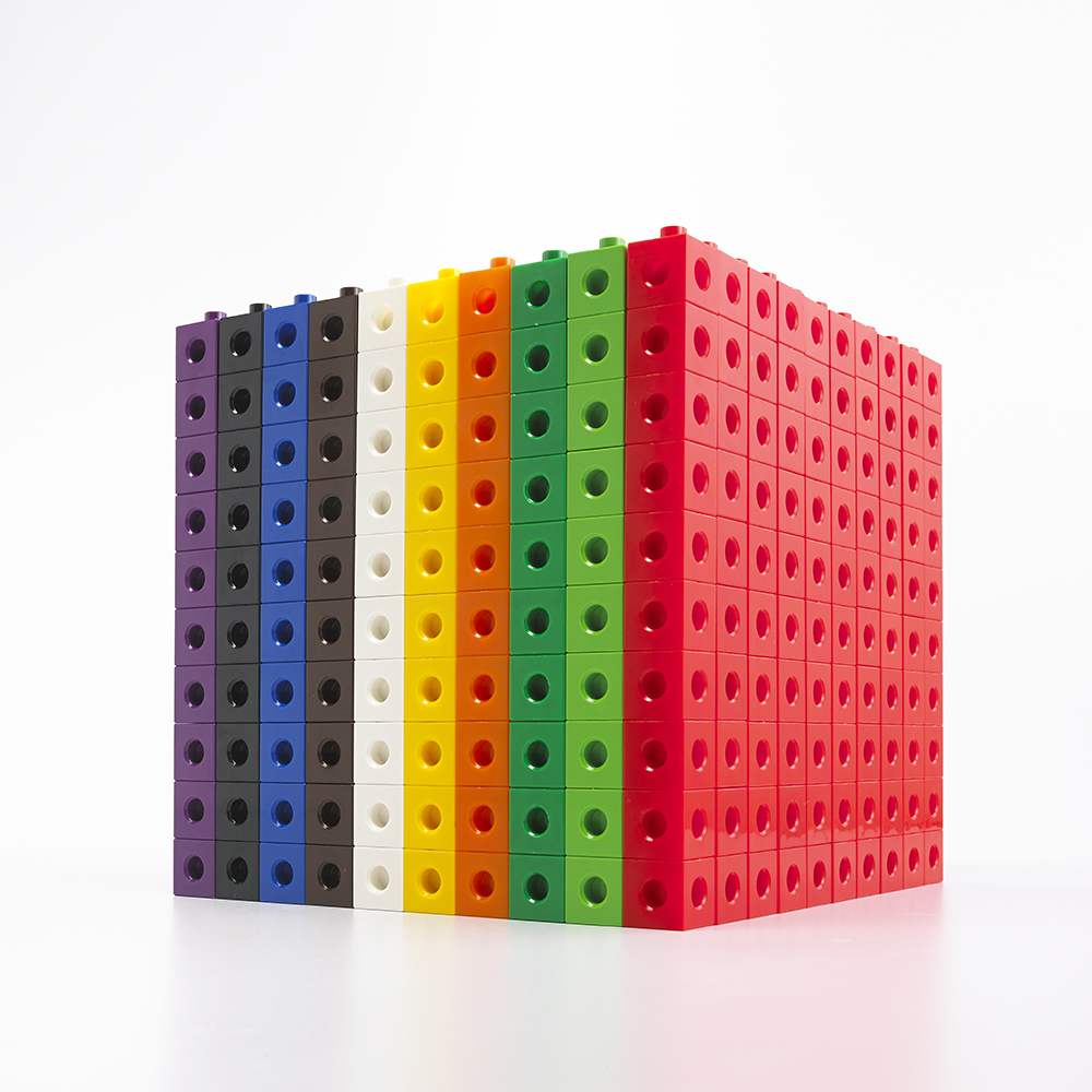 1000 соединяющих между собой кубиков ярких цветов. Кубики плотно и без особых усилий соединяются между собой, что позволяет ребенку строить множество разнообразных моделей. Соединяющиеся кубики имеют отверстия, в которые можно вставлять шипы других кубиков, состыковывая их вместе. Кубики помогают малышу научиться считать, сортировать, классифицировать и просто строить башни, замки, гаражи, самолеты.