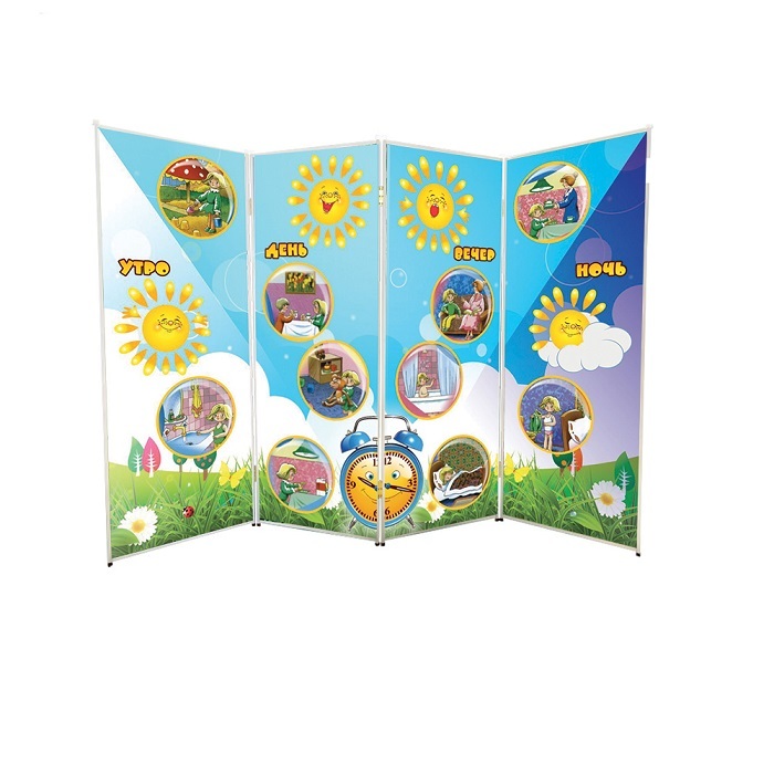 Дидактическая ширма представляет собой складную переносную перегородку, состоящую из четырех секций. Каждая сторона секций представляет собой полноцветное дидактическое панно с интегрированными рельефно-визуализационными элементами. На панно представлены времена суток.