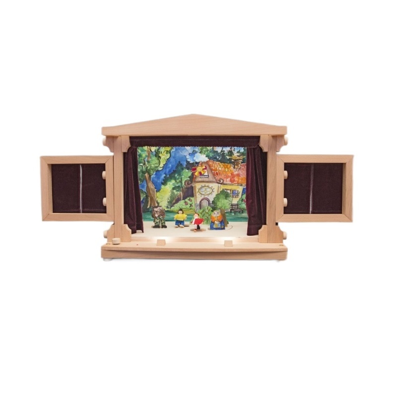 Это миниатюрная модель настоящего театрамеханизм открывает и закрывает занавес, сцена вращается, освещениеможно регулироватьПо бокам сцены -  два подвижных крылаэкраны для рук “актеров”. Нарисуйте свои декорации, своих героев и пусть шоу начнется!