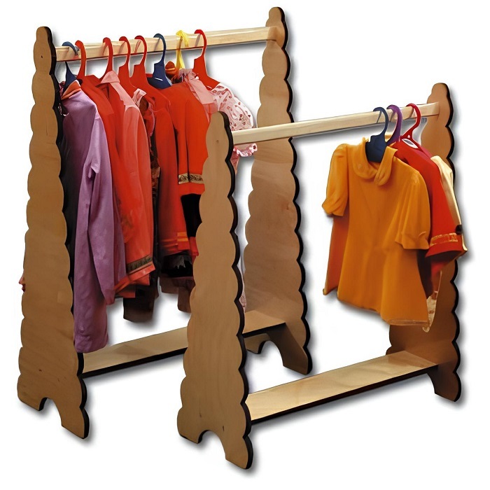 Вешалка ряжений предназначена для свободного доступа детей к костюмам и нарядам. Она устойчива, не имеет острых углов и может быть расположена в любом месте группы или детской комнаты. Несмотря на небольшие размеры, вешалка ряжений позволяет разместить большое количество нарядов, включая головные уборы и обувь.