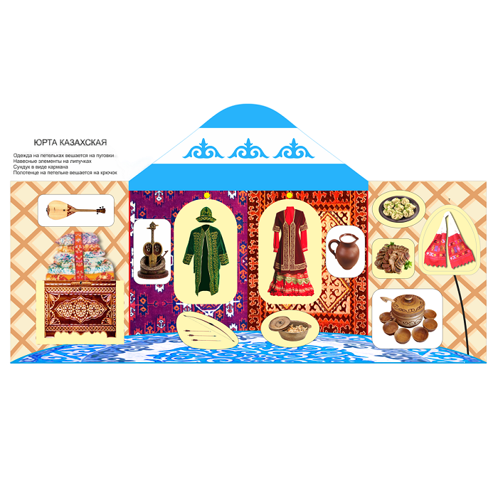 Папка «Юрта казахская» изображает внутреннее убранство юрты: предметы мебели, посуду, национальную одежду.