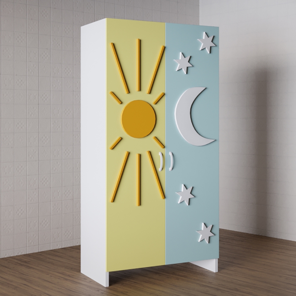 Шкаф «День Ночь» — необычный элемент интерьера детской комнаты, который подходит для мальчиков и девочек разных возрастов. Данная модель шкафа выполнена из качественных, а главное безопасных материалов, что позволяет детям раннего возраста самостоятельно складывать вещи, без помощи взрослых. Дверцы шкафа легко открываются и закрываются, а глубокие, вместительные полки для одежды, а также иных вещей и даже игрушек, позволяют держать все в поле зрения ребенка. Необычный дизайн шкафа привлекает внимание детей, что стимулирует к поддержанию порядка и занятиям малышей разного возраста.