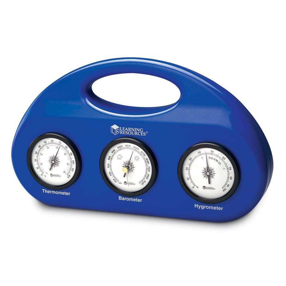 Метеостанция состоит из пластмассового корпуса с рукояткой и тремя гнездами, в которые устанавливаются съемные стрелочные приборы для измерения температуры окружающей среды, атмосферного давления и влажности.