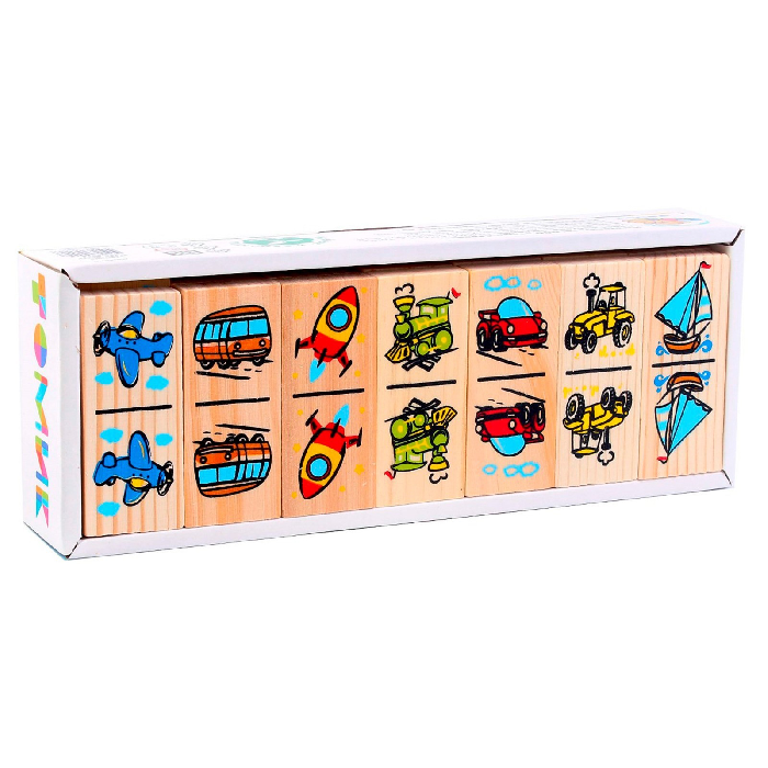 Домино "Транспорт" представляет собой 28 пластинок, разделенных на две половины, с изображениями различных транспортных средств.