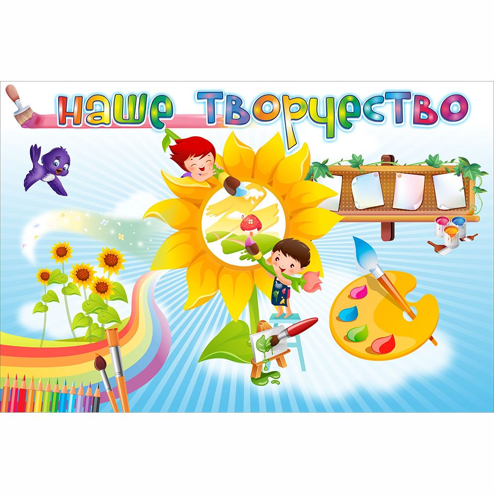 Магнитный стенд для закрепления детских рисунков выполнен в позитивной солнечной гамме. В центре довольные дети разрисовывают мольберт-подсолнух. Вокруг расположились еще несколько подсолнухов, краски, карандаши, яркая палитра и небольшая выставка детских рисунков. Для названия использованы буквы оригинальной формы, стилизованные под раскрашенные детьми. Такой позитивный стенд станет отличным оформлением уголка творчества в детском саду