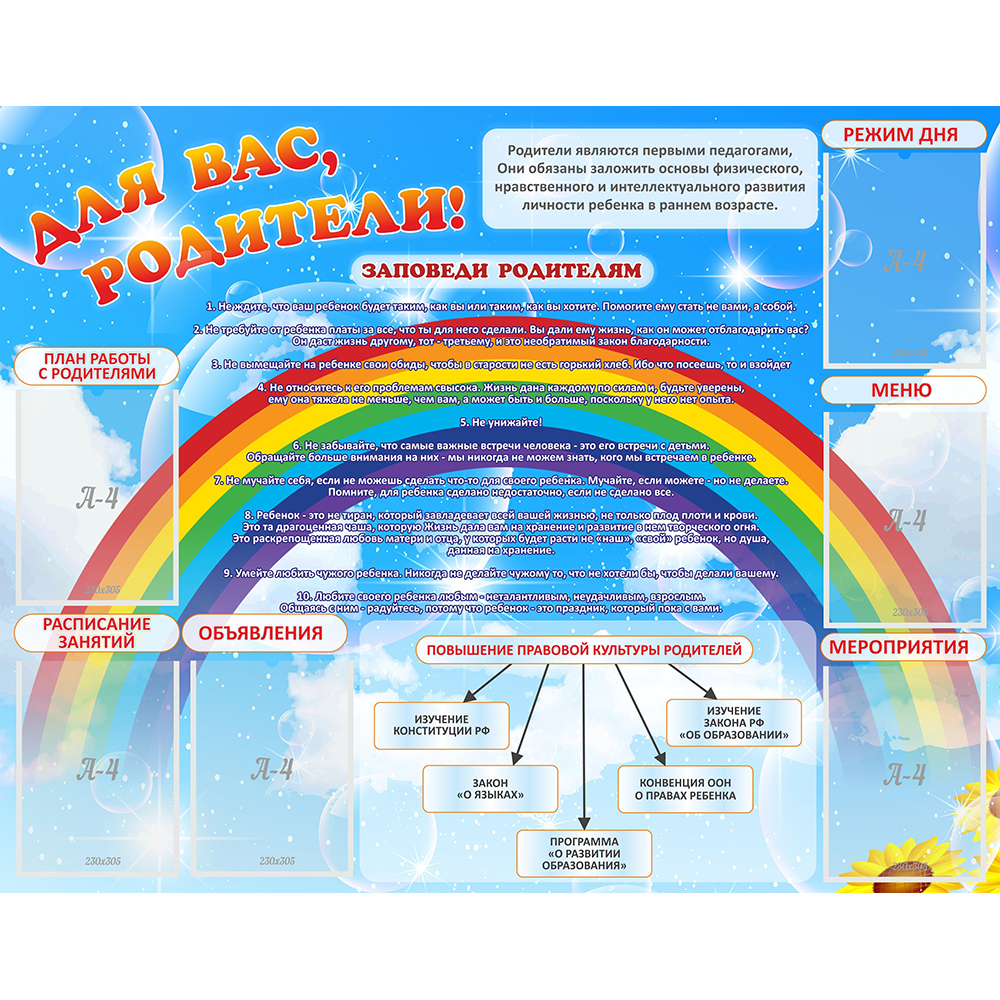Полезная информация, расписание занятий, правила внешнего вида и поведения, все это важно знать каждому родителю, чей ребенок обучается в детском саду. Поэтому важно донести эту информацию интересно, красиво и оригинально. Поможет в этом яркий стенд, специальный, информационный, который сделан максимально практично. На нем можно сразу разместить несколько объявлений, новых правил, в общем, любую информацию, которая будет актуальна для каждого родителя. А привлекательный внешний вид делает стенд более интересным в дизайнерском отношении. Он станет прекрасным украшением вашего детского сада.