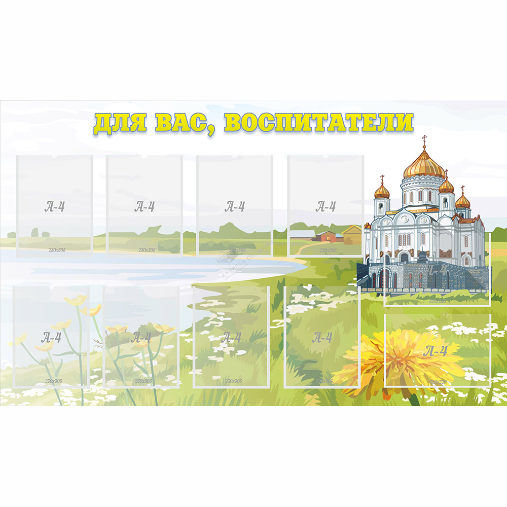 В оформлении стенда использованы виды родной природы и элементы православной культуры. Стенд оснащен 8 вертикальными и 2 горизонтальными карманами формата А4, поэтому на нем поместится вся необходимая информация - объявления, списки детей, расписания занятий, распорядок дня малышей и прочее. Все информационные листы легко заменяются на новые.