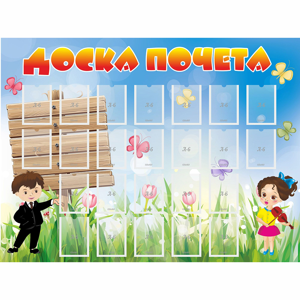 Этот стенд отличает оригинальный дизайн, интересное цветовое решение. Название традиционно располагается в верхней части стенда, имеет необычный шрифт и красивую расцветку. Буквы в названии заполнены градиентом желто-оранжевого цвета, а границы букв выполнены в белом цвете. Карманы предполагают размещение цветных фотографий. В качестве фона выступает яркий летний мотив. Луг, на котором растет сочная трава, расцветают нежные тюльпаны, а в небе летают бабочки. Стенд понравится не только детям, он и взрослым. Каждый из родителей будет рад увидеть своего ребенка на доске почета.