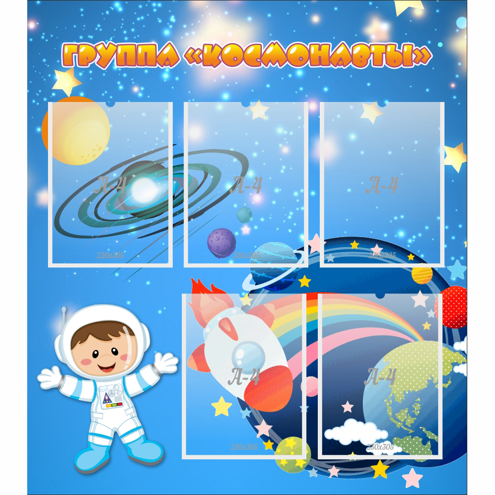 Дизайн стенда разработан по космическим мотивам. Название стенда нарисовано яркими буквами необычной формы. В пяти прозрачных карманах можно поместить информацию о сетке занятий для детей, ежедневном меню, планируемых мероприятиях, контактных телефонах воспитателей. Такой стенд будет хорошо выглядеть в раздевалке или на стене у входа в группу.