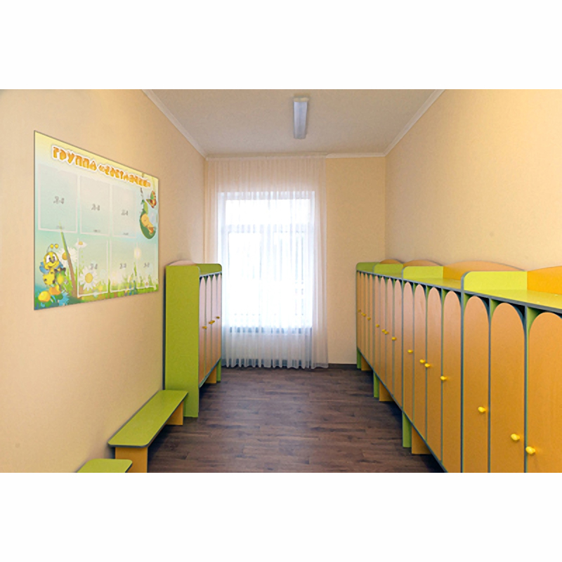 Карманы расположены в центре стенда в два ряда. Стенд большой по размеру, его удобно расположить в раздевалке или при входе в группу. При изготовлении используется современный качественный материал.
