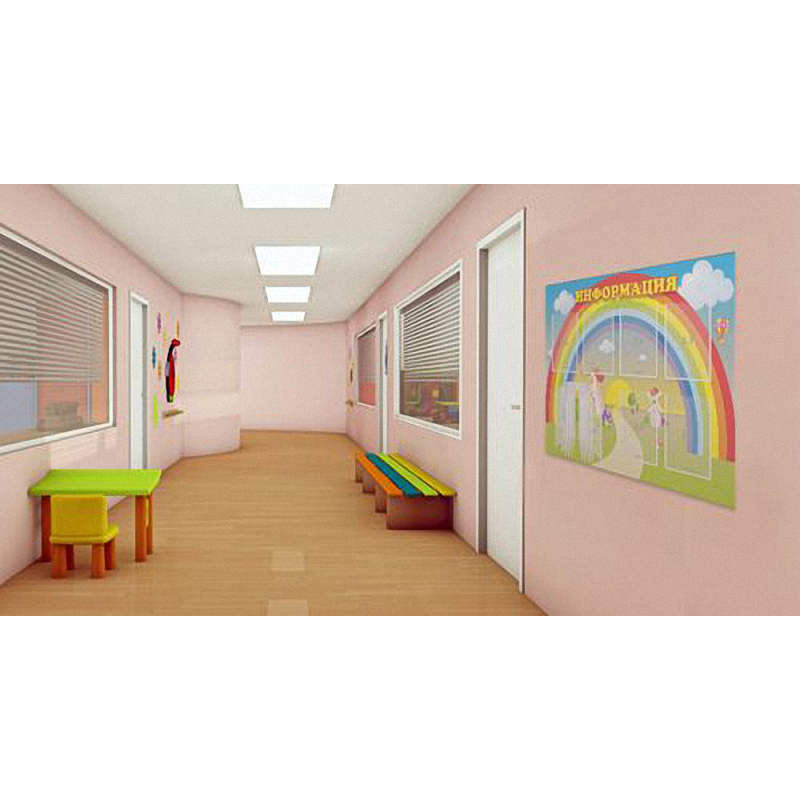 Яркий дизайн этого стенда не останется незамеченным и взрослыми и детьми. Извилистая дорога, уходящая прямо к солнцу, приглашает пройти через ворота, выполненные в виде огромной радуги, в сказочную страну. Главным элементом дизайна является раскрытая книга в левом нижнем углу стенда. Данная перекидная система позволяет поместить достаточно большое количество важной информации.