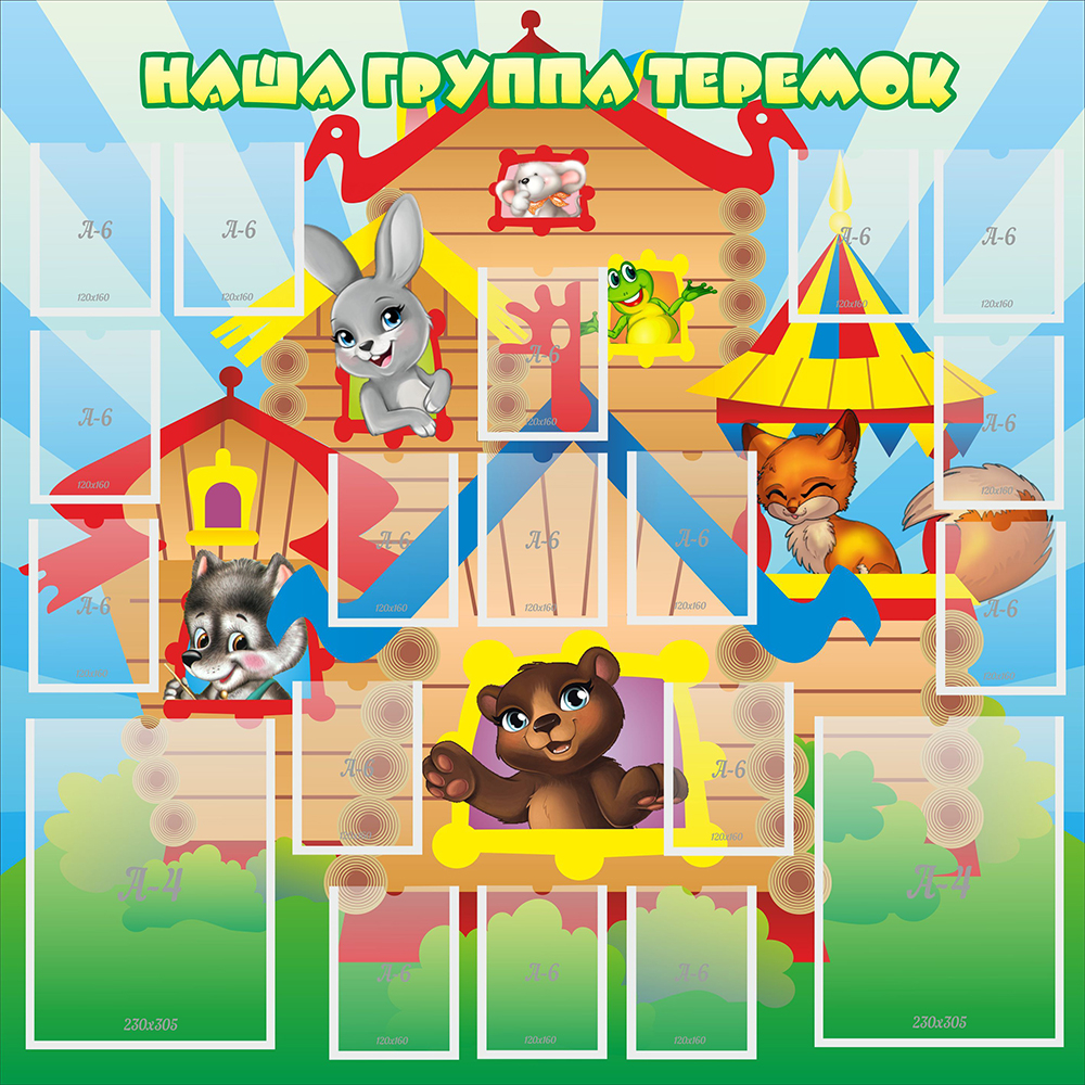 Стоит в поле Теремок. А в нём живут не только сказочные обитатели. На стенде "Наша группа теремок" расположено целых 17 карманов формата А6 для фотографий воспитанников группы. А два кармана формата А4 дают возможность разместить список группы, различные объявления и прочую необходимую родителям информацию.