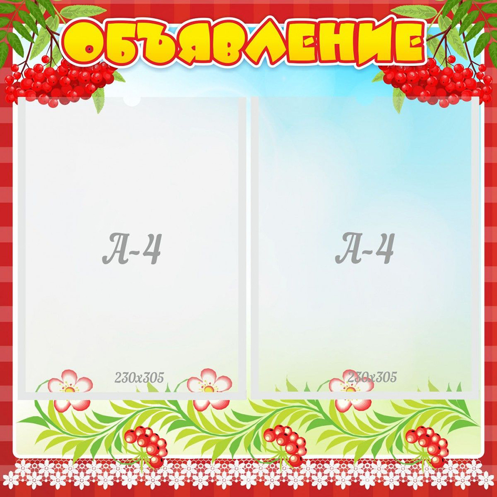 Стенд украшен изображением листьев, цветов и гроздей рябины. Различные важные объявления и информационные плакаты для детей и их родителей можно размещать в двух удобных карманах формата А4, изготовленных из прочного прозрачного пластика.