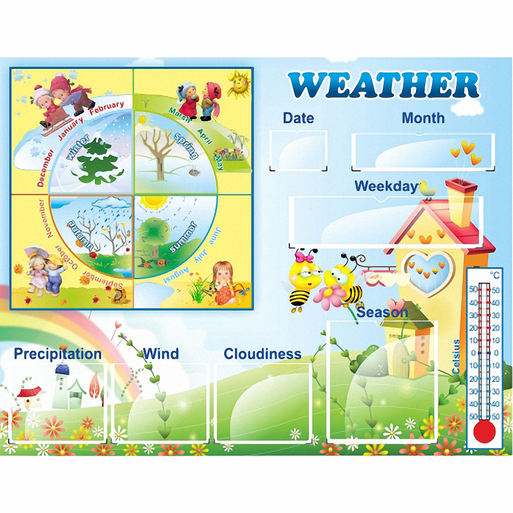 Предлагаем Вашему вниманию отличное наглядное пособие для дошкольных учреждений с изучением английского языка. Данный стенд создан для эффективного привлечения внимания каждого ребенка, чтобы они запомнили английские названия времен года, дней недели, погоды и другую полезную информацию.