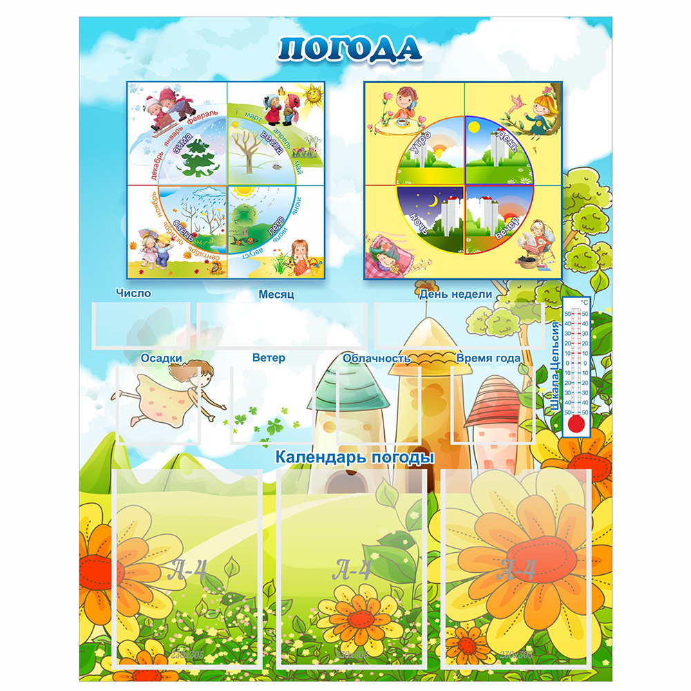 Не все детки могут похвастаться своим умением различать погоду, особенно детки младших групп. И, конечно же, этому нужно их научить. Проще сделать это с помощью данного замечательного стенда, который имеет все необходимые слова и картинки для того, чтобы детям было проще научиться различать времена года и погоду.