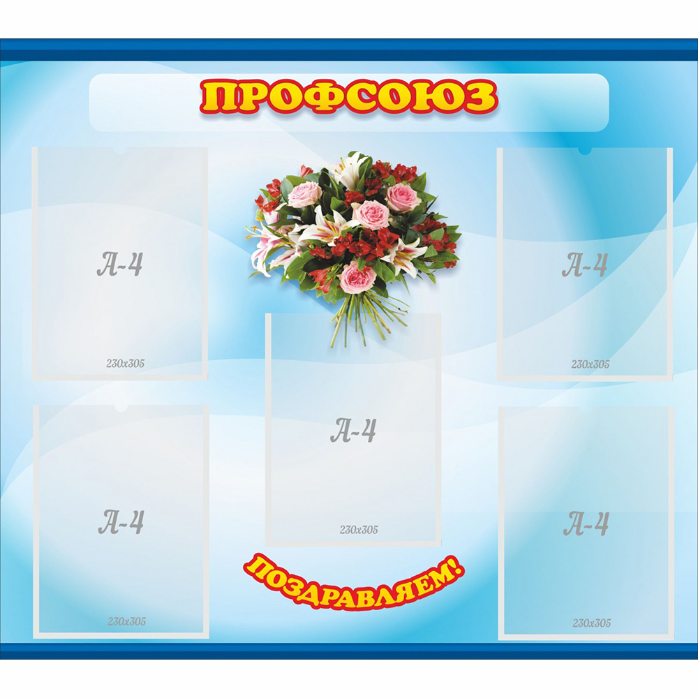 Предлагаемы Вам стенд благодаря специальным карманам, позволяет разместить различную информацию, касающуюся жизни Вашей профсоюзной организации: Устав, состав профсоюзного комитета, Коллективный договор и заметки по его исполнению, различные объявления и много другое. Отдельное место отведено поздравлениям сотрудникам с разного рода знаменательными датами.