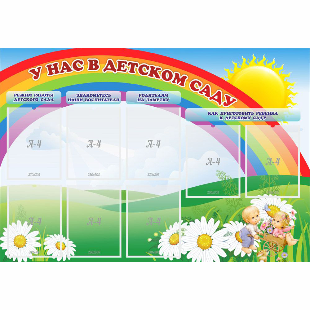 Стенд для родителей малышей, поступающих в детский сад. Размещается на самом видном месте, у входных дверей, в холле, либо перед дверьми кабинета заведующего детским садиком. Украшен изображением радуги, солнца и цветов. На стенде есть специальные разделы «Режим работы детского сада», «Знакомьтесь, наши воспитатели», «Родителям на заметку», «Как приготовить ребенка к детскому саду». В пустых карманах формата А4 можно разместить важные объявления, плакаты, фотографии и различные информационные листы о жизни детского сада.