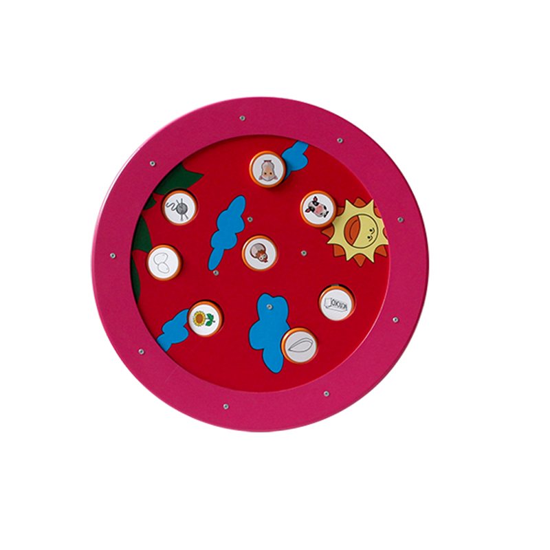 Игровой модуль представляет собой планшет в форме круга с расположенными на нём изображениями, образующими смысловые пары (подсолнух - семечка, белка - орехи, курица - яйцо, собака - кости). При нажатии на один из элементов пары появляется второй элемент.
