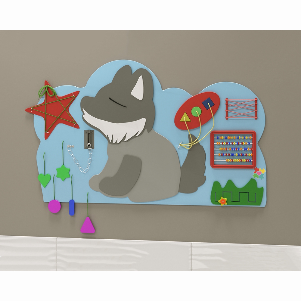 Бизиборд «Волк» — это ценный детский игровой модуль, ведь с его помощью можно не просто занять ребёнка, но сделать это с пользой для его развития. А ещё настенную панель легко расположить в небольшом помещении благодаря компактному исполнению, что выгодно отличает её от объёмных аналогов. Поверхность обработана специальным образом и имеет многослойное покрытие из экологически безопасных материалов.