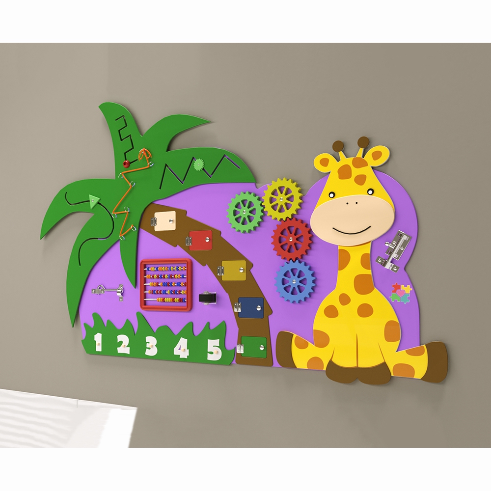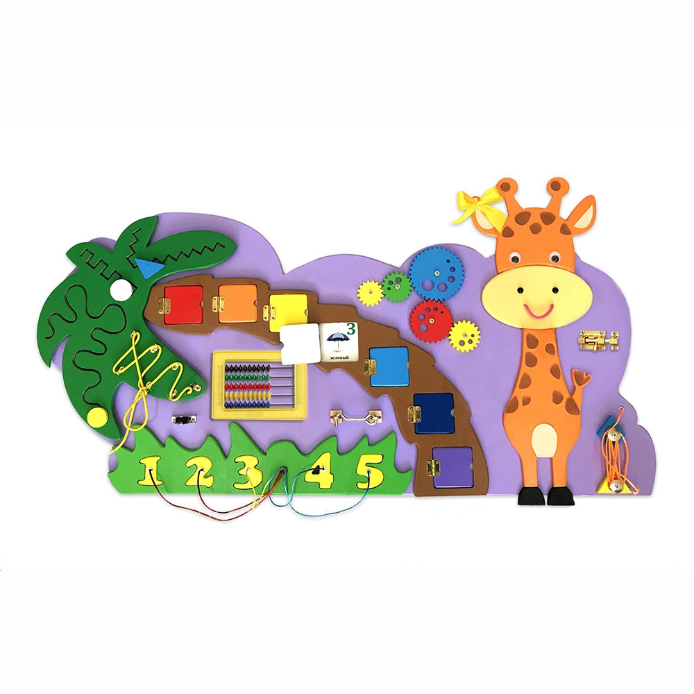 Бизиборд «Жираф» - оптимальное решение для небольших помещений, потому что он сохраняет игровую ценность и экономит пространство. Основа выполнена в виде фиолетового облачка, на котором размещён весёлый Жирафик, пальма и полянка с зелёной травкой. Все края закруглены и обработаны по специальной технологии, что гарантирует безопасность в использовании даже самыми маленькими детками.