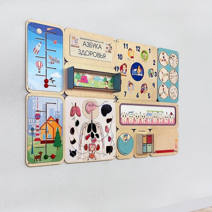 Главная Каталог Подготовительная группа и детский сад Сенсомоторное развитие Сенсорные панели для детей Дидактическая настенная панель «Азбука здоровья»