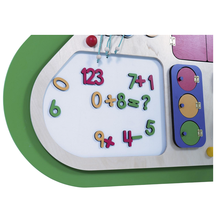 Бизиборд изготовлен из МДФ с трехслойным покрытием безопасной краской на водной основе.