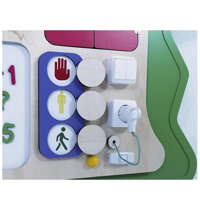 Главная задача бизибордов: помочь детям безопасно освоить предметы быта (защелки, крепления, механизмы, переключатели, розетки).