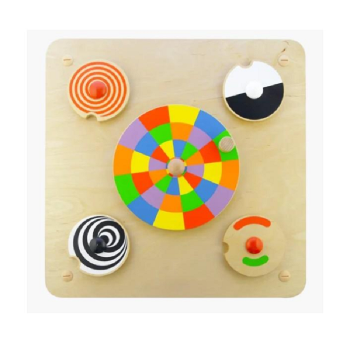 Панель выполнена из березовой фанеры, лицевая часть панели содержит 5 красочных колес. Сенсорная игрушка, используемая для визуальной релаксации, развивает двигательные навыки. Способствует снятию эмоционального напряжения. Центральное большое цветовое колесо имеет блоки цветов и ветровую ручку. При вращении цвета имеют тенденцию сливаться и смешиваться, создавая новые цвета и узоры. Цветные круги меньшего размера не имеют ручек, но имеют выемки для пальцев, позволяющие детям вращать их, создавая захватывающие визуальные эффекты. Популярно среди детей, которые хотят заняться процессом вращения колесиков в разных направлениях (и очень нравится детям с аутистическим спектром).