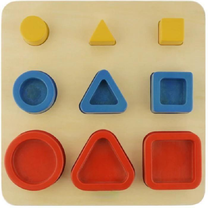 На лицевой стороне панели расположены 3 комплекта составных блоков с выемками в виде геометрических фигур в 3 ярких цветах: красный, желтый и синий. Панель выполнена из березовой фанеры. В процессе игры дети сортируют блоки по цветам, в соответствии с геометрическими формами на панели, строят пирамидки, вставляя подходящий по форме меньший блок в блок большего размера. Очень хорошая игрушка для развития логических навыков.