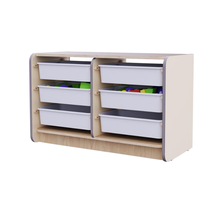 Двойной модуль для хранения игрушек создан для организации пространства в игровой комнате детского сада. Укомплектован 6 пластиковыми ящиками, полностью вынимающимися из полозьев, что помогает поддерживать порядок и чистоту в ДОУ.