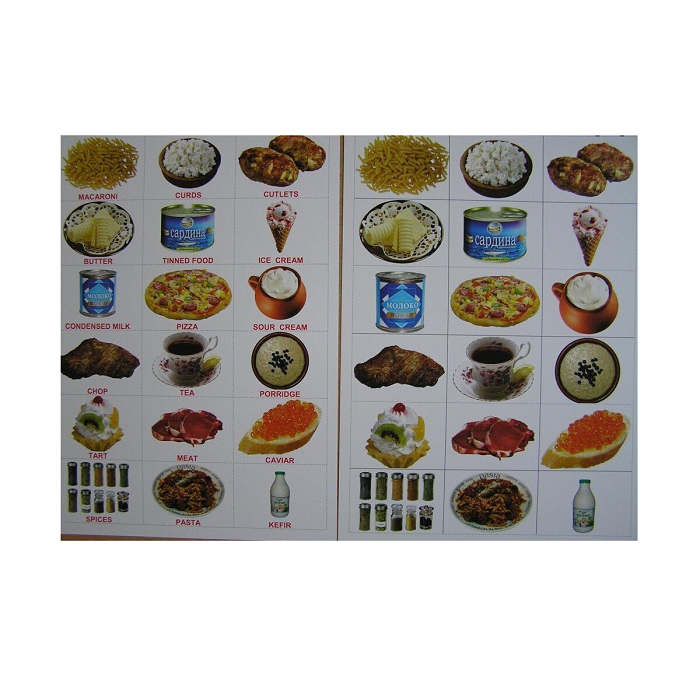 Перевод (на карточках перевод не указывается): Ветчина, джем, картофель, конфета, колбаса, макароны, мороженое, пицца, печенье, мясо, пельмени, пирожное, рогалик, шоколад, суп, сыр, хлеб, рис, кукурузные хлопья, жареная курица, торт, яичница, молоко, творог, сметана, каша, паста, запеканка, кетчуп, майонез, мука, сахар, чернослив, гречка, фасоль, пшено, коктейль, желе, салат, овсяные хлопья, рыба запеченная, блины, оладьи, пирожки, пирог, бутерброд, ватрушка, шашлык, специи, сгущенное молоко, консервы, овощное рагу, сок, оливки, пряники, вафли, масло сливочное, растительное масло, курага, изюм, котлеты, отбивная, чай, красная икра, кефир, картофельное пюре, какао, леденцы, вареники, плов, соленые огурцы, фарш.