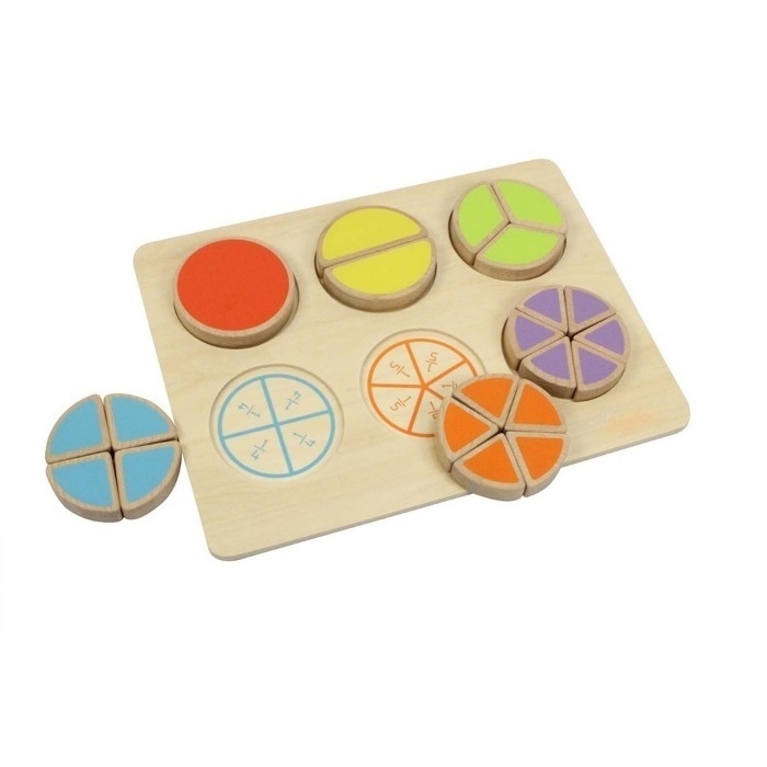 Панель предназначена для изучения понятий «часть», «целое», «дробь». На ней представлены 6 кругов, составленных из пропорциональных секторов, маркированных по долям и демонстрирующие целые и половинные значения, третьи, четвертые, пятые и шестые части. Круги разного цвета и одинаковые по размеру. Цвет доли каждого круга совпадает с цветом цифровой маркировки данной доли на обратной стороне.