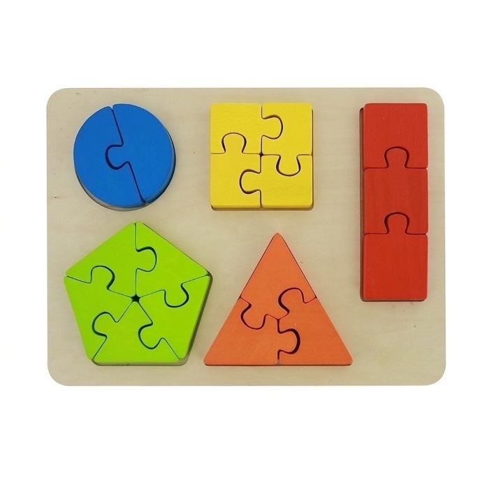 Панель выполнена из березовой фанеры, размер 38 х 28 х 2,5 см. На поверхности панели расположены цветные элементы (пазлы), которые в собранном виде представляют следующие фигуры: круг, квадрат, прямоугольник, треугольник и пятиугольник.