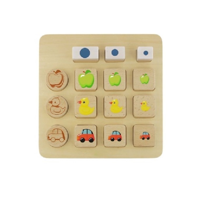 Основание панели из березовой фанеры, на лицевой части представлены деревянные блоки разных геометрических форм. Детям предлагается сопоставить блоки в соответствии с размерами от большего к меньшему, либо разместить блоки правильно в соответствующие выемки - углубления.