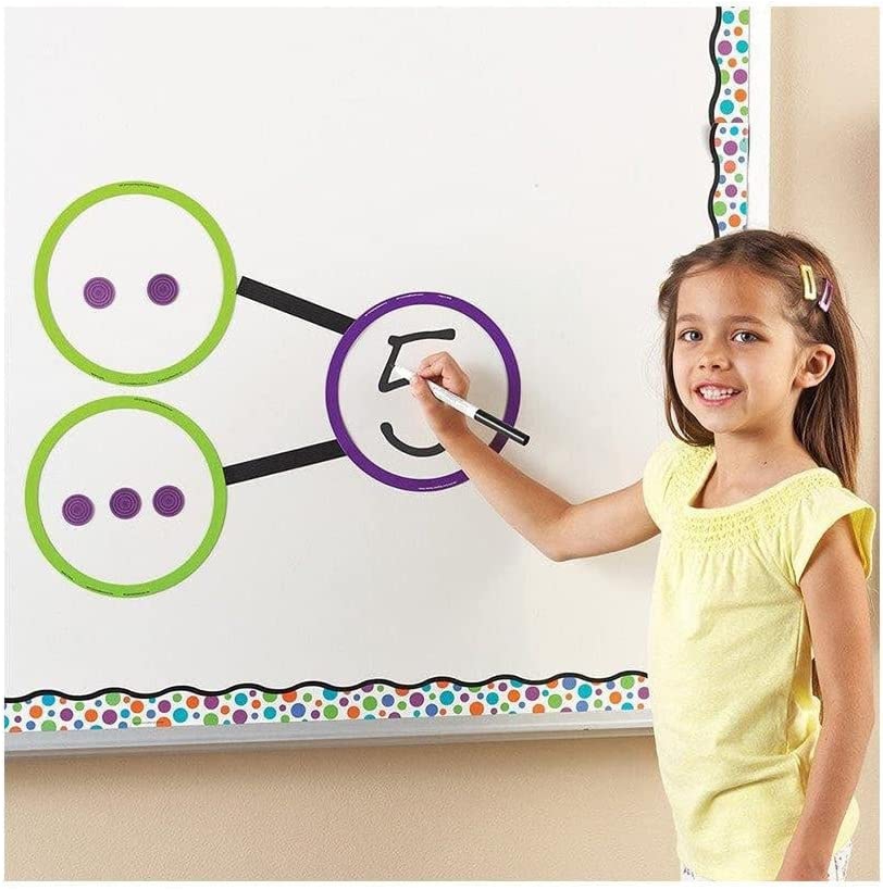 Начните с размещения двух разных магнитных дисков (3 и 2, например) в зеленых кругах или квадратах. Попросите ученика подойти к доске, потрогать и сосчитать каждый диск, а затем поместить сумму (5) в фиолетовый круг или квадрат (или просто напишите число 5). Продолжайте с другими примерами. Выполните те же действия с вычитанием.